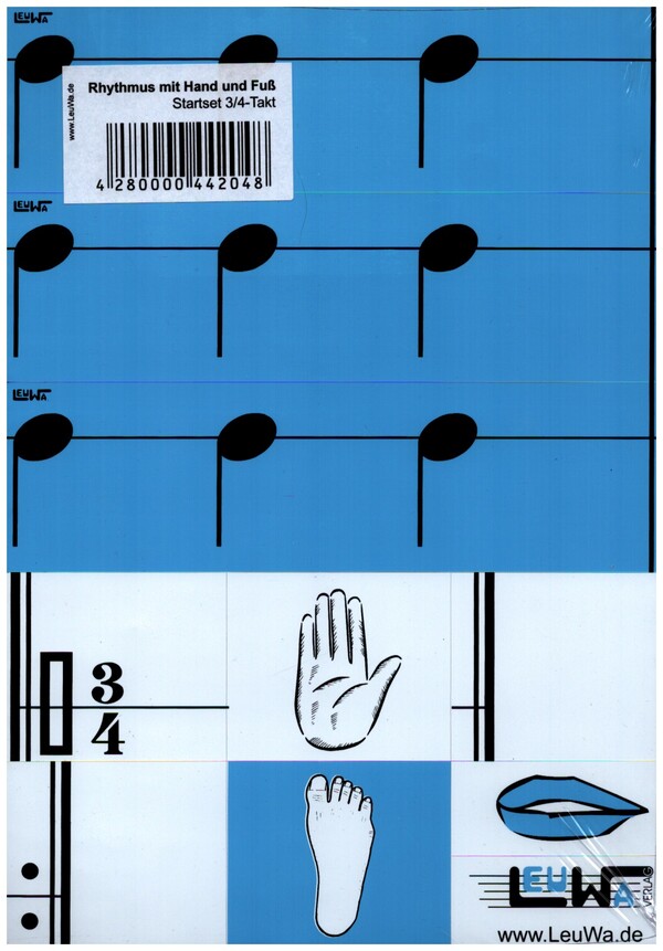 15 Karten: (Hand) alle 4 Taktvarianten aus Punktierte Halbe-, Halbe-, und Viertelnoten. (Fuß) 3 Karten für die Fußlinie. (Mund) 2 Karten für die Zähllinie. Karten für Taktart, Schlussstrich und Wiederholungszeichen. Faltblatt mit Unterrichtskonzept und Tipps.