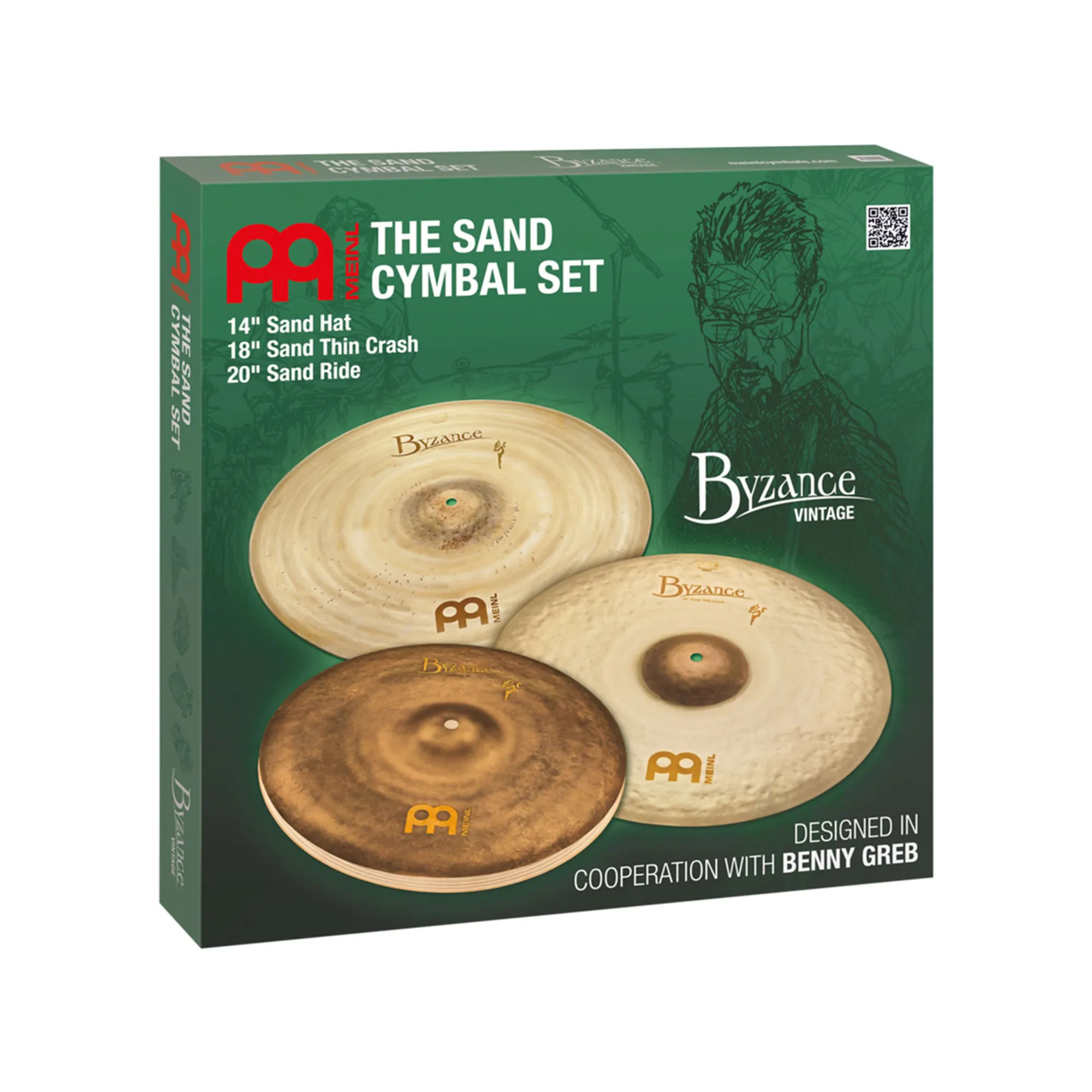 Das gematchte Meinl Byzance Sand Beckenset beinhaltet ein 14" Sand Hat, ein 18" Sand Thin Crash und ein 20" Sand Ride. Es liefert herrliche Vintage Sounds und ist ein Must-Have sowohl für Fans von Benny Grebs Spielweise und Sound als auch Freunde musikalischer Becken im Allgemeinen.