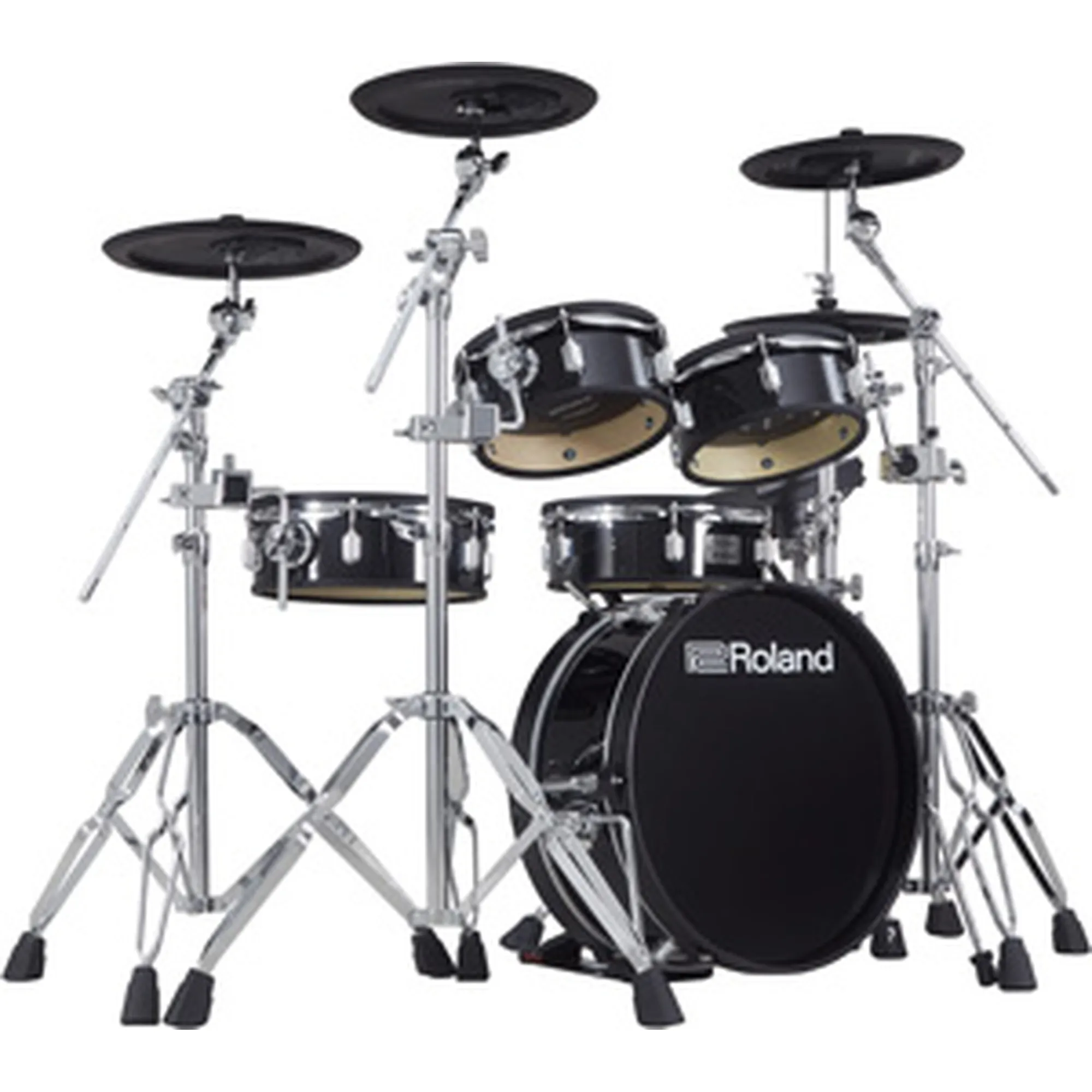 Die Art und Weise, wie akustische Trommeln und Becken montiert werden, trägt viel zum klassischen Look eines Kits bei – es beeinflusst zudem das Spielgefühl. Die Tom-Pads werden auf denselben Stativen montiert wie akustische Toms, um ein identisches Treffergefühl zu erzeugen. Für höchste Stabilität ist jedes Stativ doppelt verstrebt und lässt sich schnell und einfach verstellen.