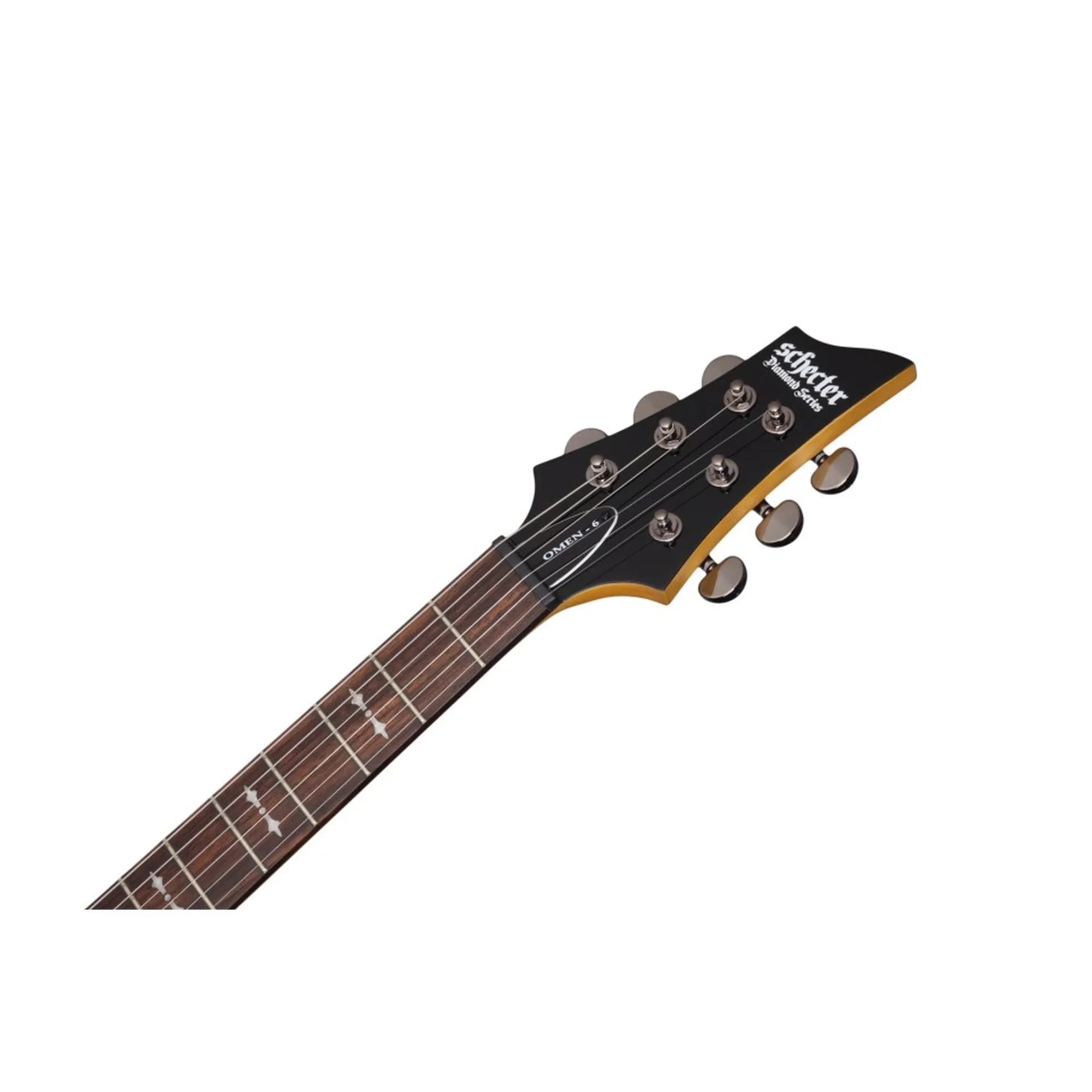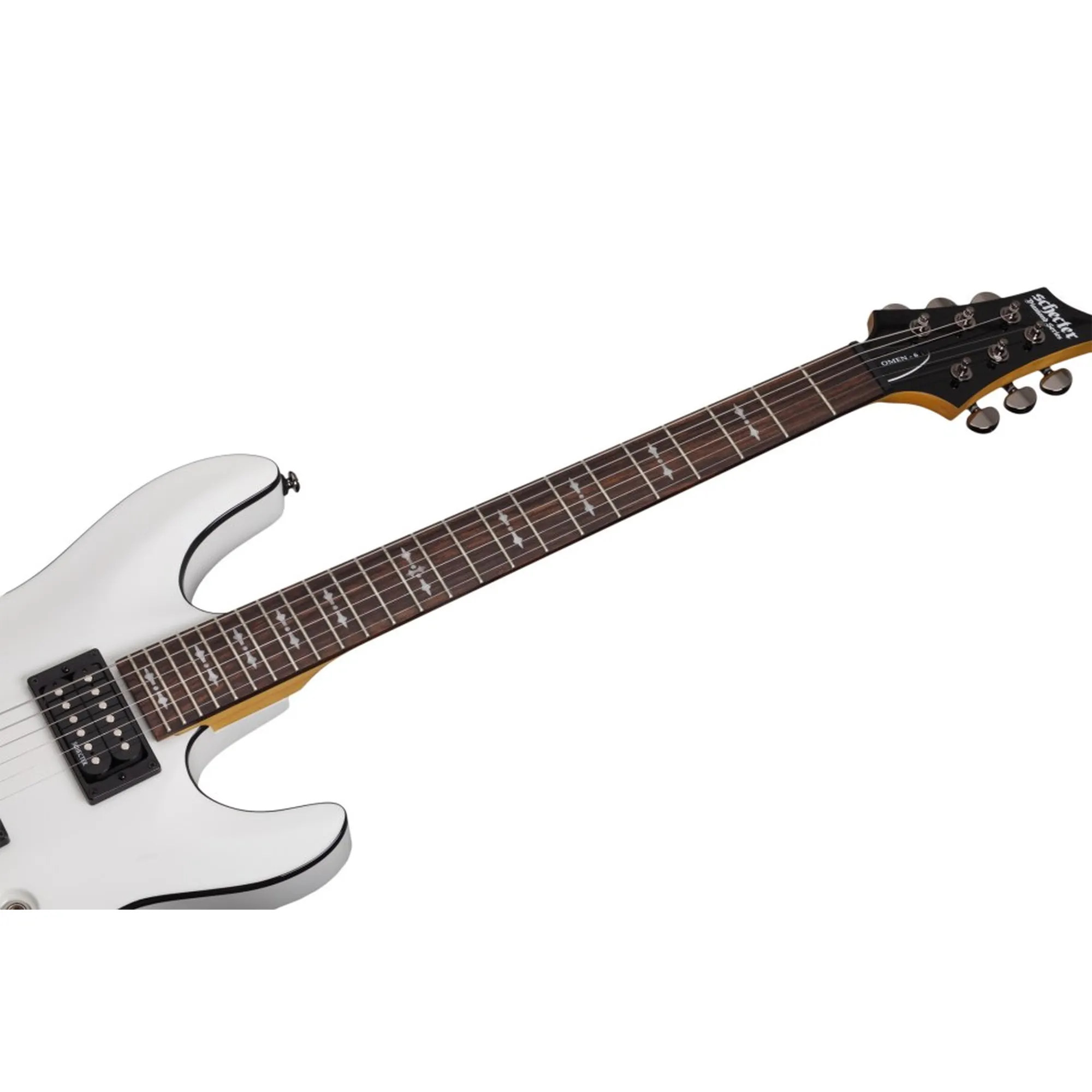 Hier kommen Schectereigene Parts zum Einsatz, wie zum Beispiel Pickups oder Mechaniken. Der Korpus ist aus Linde gefertigt, der Ahornhals mit Palisandergriffbrett ist aufgeschraubt. Inzwischen wurden die Instrumente der Omen Serie mit einem Binding und „Semi-Goth“ Pearloid Inlays aufgewertet.