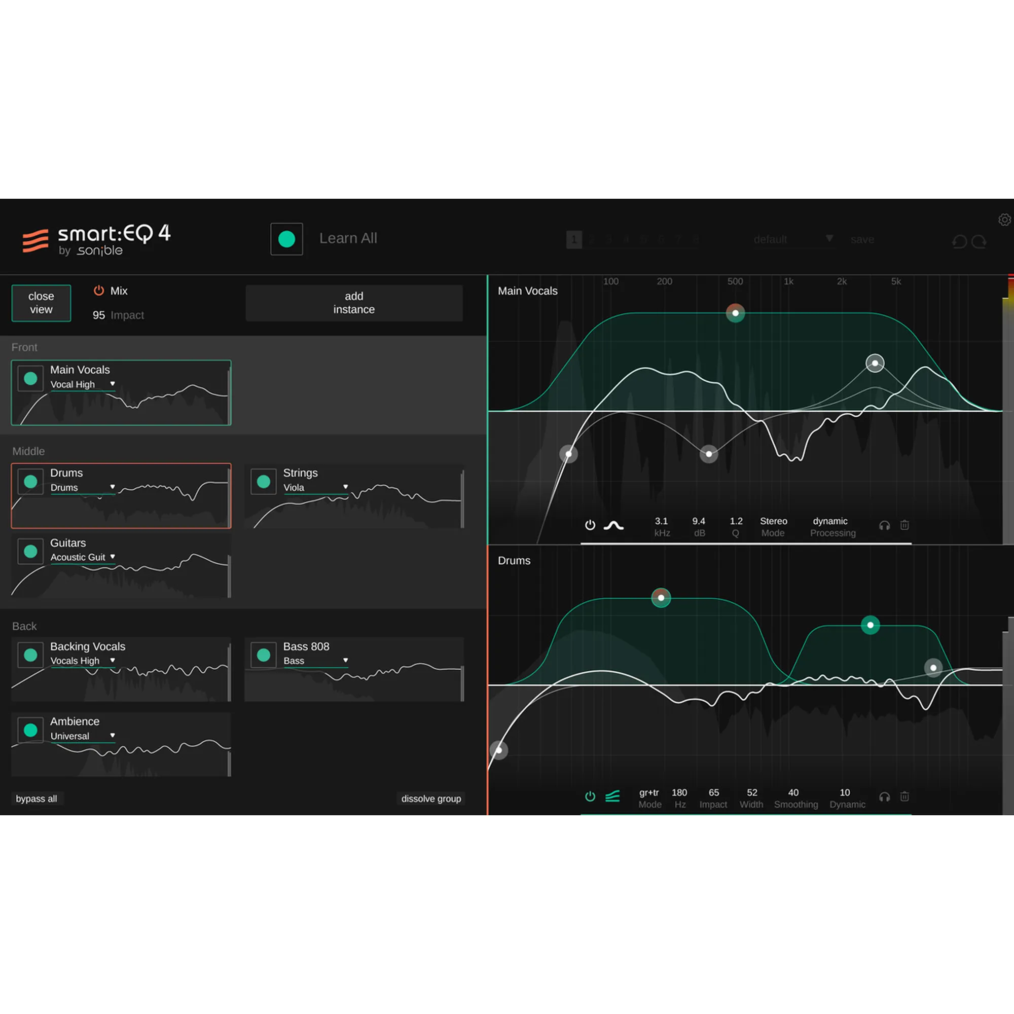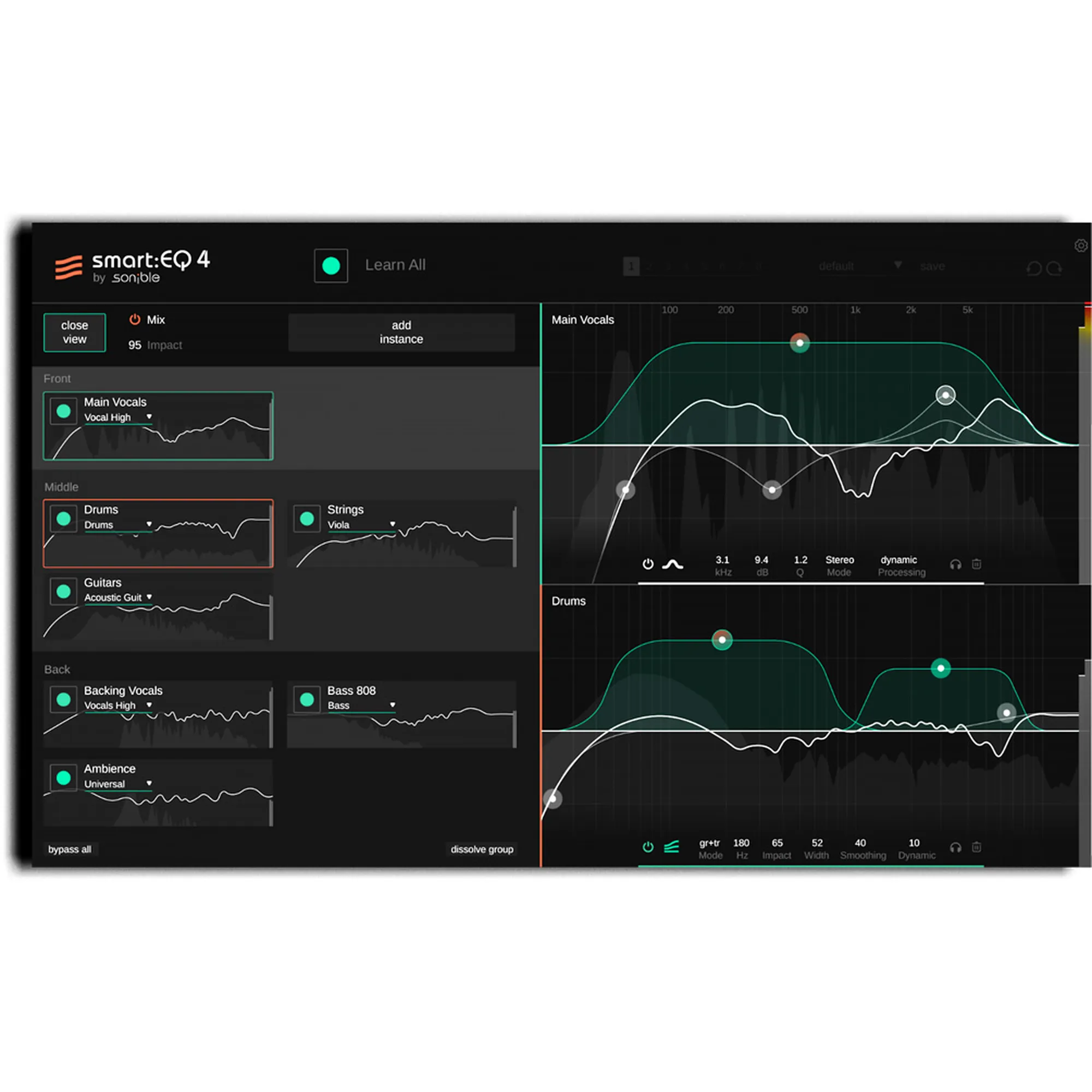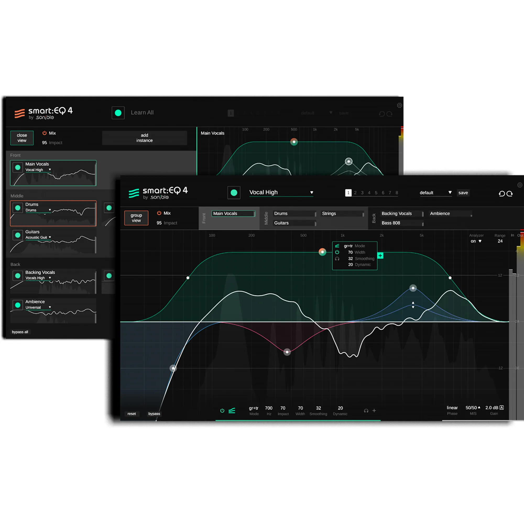 Im Gegensatz zu herkömmlichen Equalizern, die den Kontext eines Mixes nicht in die Verarbeitung miteinbeziehen, gibt dir smart:EQ 4 die Kontrolle über das Unmasking von mehreren Tracks und erledigt für dich spektrales Mixing über einfaches Dragging & Dropping von bis zu 10 Instanzen. Dadurch setzt du die Priorisierung für jeden smart:filter fest, damit bestimmte Spuren in den Vordergrund, manche in die Mitte und andere in den Hintergrund ru¨cken. Ein hin- und herschalten zwischen Instanzen ist mit diesem innovativen Tool Geschichte – in smart:EQ 4 kann jede Instanz derselben Gruppe von jeder anderen Instanz aus gesteuert werden.
