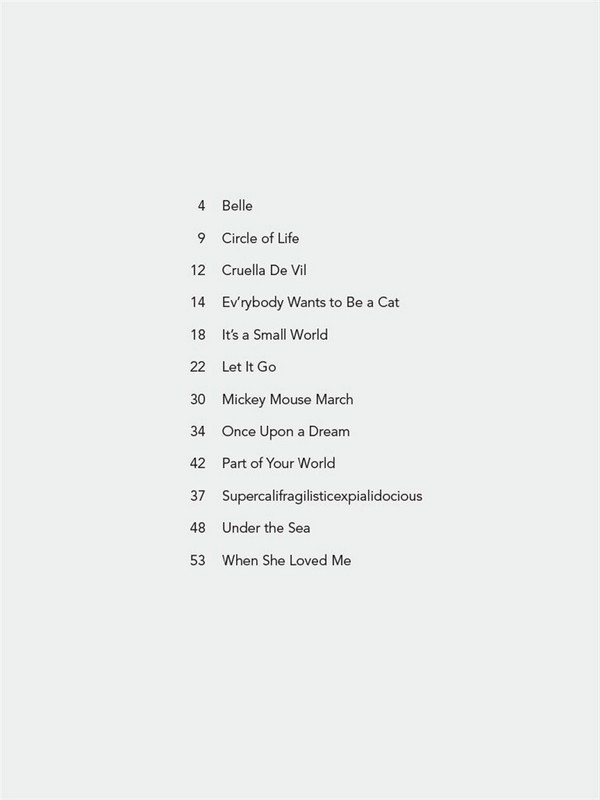 12 Favorites reimagined with a Jazz Flair Belle (Beauty And The Beast) Circle Of Life (The Lion King) Cruella De Vil (101 Dalmatians) Ev'rybody Wants To Be A Cat (The Aristocats) It's A Small World (Disneyland Resort(R) and Magic Kingdom(R) Park) Let It Go (Frozen) Mickey Mouse March (The Mickey Mouse Club) Once Upon A Dream (Sleeping Beauty) Part Of Your World (The Little Mermaid) Supercalifragilisticexpialidocious (Mary Poppins) Under The Sea (The Little Mermaid) When She Loved Me (Toy Story 2)