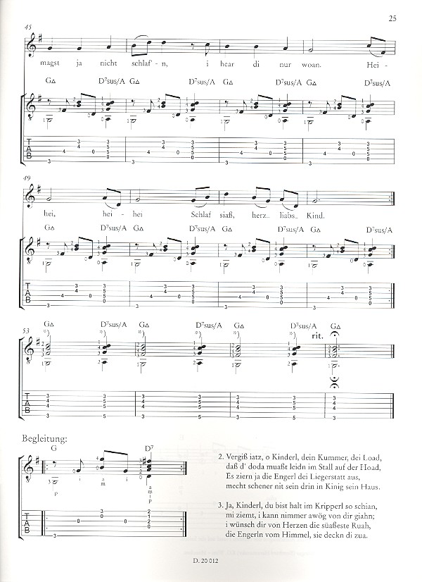Oser, Stefan, arr. Christmas Carols Pop Jazz Latin Fingerstyle Arrangements Stille Nacht Winter Wonderland O Tannenbaum Maria durch ein' Dornwald ging Please come home for Christmas Es wird scho glei dumpa Es ist ein Ros entsprungen Feliz Navidad O Tannenbaum du trägt einen grünen Zweig Alle Jahre wieder Schneeflöckchen Weißröckchen Leise rieselt der Schnee Soloversion für Fingerstyle-Gitarre / Fingerstyle-Version für Begleit-Gitarre (Picking und teilweise Strumming möglich) / zum vereinfachten Erlernen: Standard- und Tabulaturnotation und Griffbilder. Die Stücke können einerseits als Solostücke, aber auch isoliert als Duo- oder Gruppenstücke mit Melodieinstrument bzw. Stimme interpretiert werden. Für das rhythmische Verständnis empfiehlt es sich, zunächst die Begleitvorschläge gesondert zu üben. Die den Liedern zugeordneten Akkorddiagramme sind in ihrer jeweiligen Reihenfolge des Partiturablaufes dargestellt. Für den Gruppenunterricht mit Anfängern ist es auch möglich, eine zusätzliche Begleitstimme mit einfachen Dreiklangsakkorden hinzuzuziehen. Die vorliegenden Versionen sollen trotz der teilweise sogar metrischen Veränderungen den Charakter der einzelnen Stücke nicht beeinträchtigen. 'Silent Guitar Night' bietet dem entsprechend interessierten Saitenzupfer 13 weihnachtliche Lieder internationaler Prägung, arrangiert in diversen Grooves, die sich stellenweise weit vom Original bewegen und gerade daher Spaß machen. 'O Tannenbaum im 5/4-Groove? 'Schneeflöckchen, Weißröckchen' als Baiao? Klar, warum nicht? Oser hat sich beim Arrangieren sichtbar Mühe gegeben und viele Stücke nicht nur rhythmisch, sondern bevorzugt harmonisch aufgepeppt, einige gar quasi neu harmonisiert. Den Gitarristen erwarten modern tönende Versionen, weihnachtliche Multi-Kulti-Gitarre, notiert in Noten plus Tabs, reichlich versehen mit Fingersätzen für beide Hände und Akkordsymbolen. Zusätzlich gibt es für alle Songs die verwendeten Griffe als Diagramme also alles da, was das Einüben fördert. Die Zielgruppe für diesen Spielband dürfte der mittelweit fortgeschrittene Fingerstyle-Gitarrist sein, der keine harmonischen Ängste in sich trägt und unterm Christbaum mal was anderes spielen will wozu dann aber schon alle mitsingen sollen. Entsprechend bunt sind die Arrangements angelegt, mal für Sologitarre, mal für zwei Gitarren oder Gitarre plus Melodieinstrument bzw. Gesang. Auch an Begleit-Tipps hat der Autor gedacht. Der Doblingerverlag bietet statt einer Begleit-CD auf seiner Website kostenfreie MP3-Downloads von Listening- und Playalong-Versionen der Arrangements an. Empfehlenswert für kundige Gitarrenspieler, die das Weihnachtsfest musikalisch mal etwas anders gestalten möchten. (Andreas Schulz, AKUSTIK GITARRE 6/2010) () Hier ist die stille Nacht gemeint, mit der es dann auch gleich ganz flott losgeht. Denn der Bearbeiter hat sich zu seinem bunten Reigen aus bevorzugt traditionellen bzw. alt bekannten Weihnachtsliedern einige Varianten ausgedacht und sie in ein modernes musikalisches Kleid gesteckt. () Herausgekommen sind dabei verschiedene Spielmöglichkeiten, wenn man so will auch ein Musik-Puzzle, das man nach eigenem Geschmack und individuellen Spielfähigkeiten zusammenstecken kann, also eine Mischung aus Spiel- und Lehrmaterial, so dass der Spieler neben dem Spaß auch noch technische Spielfähigkeiten erwerben kann, wenn er denn möchte. (). Für Spieler, die auf weihnachtlich-musikalische Abenteuerreise gehen wollen, scheinen diese Arrangements auf den Leib geschneidert zu sein, denn es werden Klänge erzeugt, die das alte Liedgut merklich entschlacken. (GITARRE AKTUELL, IV/2010) '(...) The idea behind the book is to present some Christmas tunes in a new environment. They are all presented with a melody line and the words then a guitar notation, then tab. You do also get a useful loose-leaf set of pages with the chord shapes usefully enclosed. The first piece is Silent Night, but in 4/4 with a bossa nova rhythm. OK, it is a little odd, but after the initial doubts, it does work quite well. Then follows Winter Wonderland presented in swing, others include O Tannenbaum in a pop styled 5/4 arrangement and more styled as a 12/8 Blues, a 7/8 Ballade and a Rumba Flamenco to name but a few. These were quite pleasant, nicely arranged and I could imagine them working well, given the right outing.' Chris Dumigan, Classical Guitar Magazine Nov. 2011
