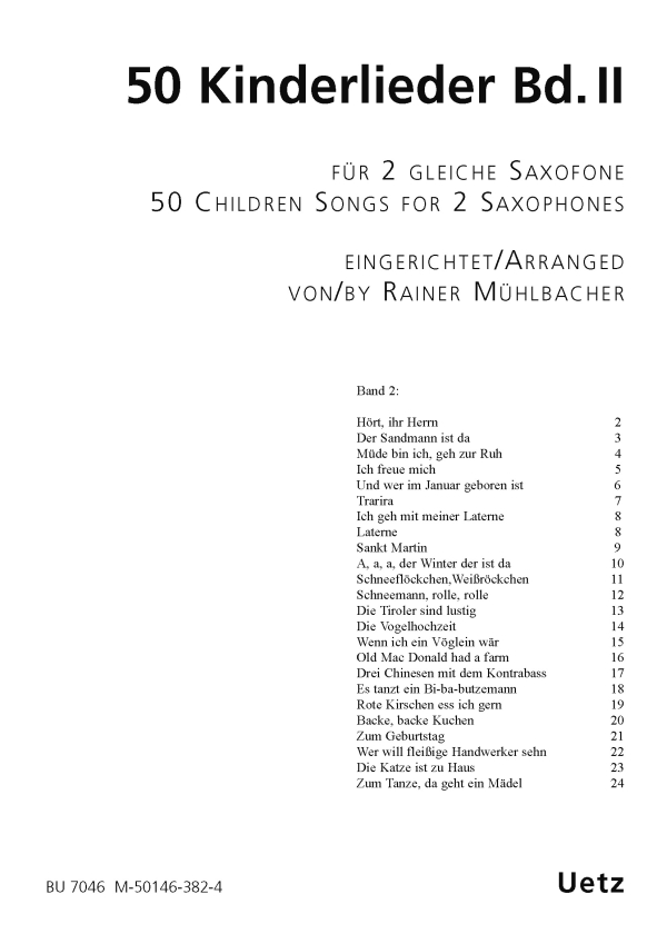 Mühlbacher, Rainer, arr. Sax attack Hört ihr Herrn Der Sandmann ist da Müde bin ich geh zur Ruh Ich freue mich Und wer im Januar geboren ist Trarira Ich geh mit meiner Laterne Laterne Sankt Martin A a a der Winter der ist da Schneeflöckchen Weißröckchen Schneeman rolle rolle Die Tiroler sind lustig Die Vogelhochzeit Wenn ich ein Vöglein wär Old Mac Donald had a farm Drei Chinesen mit dem Kontrabass Es tanzt ein Bi-ba-butzemann Rote Kirschen ess ich gern Backe backe Kuchen Zum Geburtstag Wer will fleißige Handwerker sehn Die Katze ist zu Haus Zum Tanze da geht ein Mädel