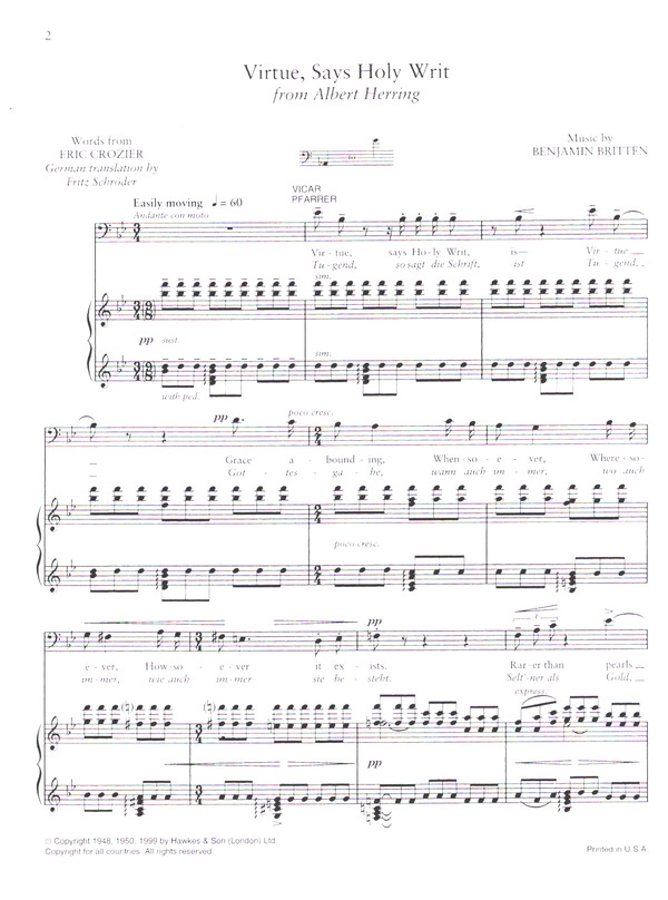Dressen, Dan, ed Virtue says holy Writ Tugend so sagt die Schrift Tickling a Trout Fischen bei Nacht Churchyard's agog with a crowd of Folks Die Kirche ist voll bis zum letzten Platz from Albert Ferring Caution is better sweet Highness Und Vorsicht ist besser als vorschnelles Handeln Gloriana Within this frail crucible of Light Im zarten Kreis nächtlich milden Lichts from The Rape of Lucretia Jemmy Legs likes me Jemmy Legs mag mich Look through the Port comes Moonshine astray Schau wie ein Mondstrahl verirrt auf mich fällt I had to strike down that Jemmy Legs Doch ich musste den Lumpenhund erschlagen from Billy Budd