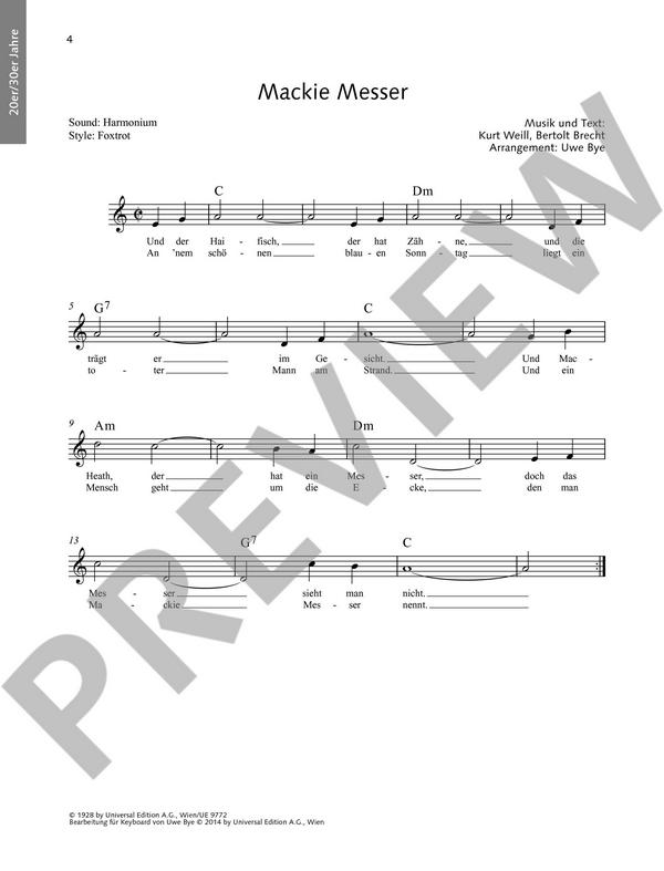 Bye, Uwe, arr. 100 neue bekannte Hits leicht gesetzt 20er/30er Jahre: Mackie Messer Schöner Gigolo La le lu Ich bin von Kopf bis Fuß auf Liebe eingestellt Musik! Musik! Musik! Am Sonntag will mein Süßer mit mir segeln gehn Lili Marleen Berliner Luft Mein kleiner grüner Kaktus Liebe mich-küsse mich Schlager & Volksmusik: Herzilein Patrona Bavariae Kufsteinlied Blau blüht der Enzian Holzmichel Sierra Madre Del Sur Zillertaler Hochzeitsmarsch Herz-Schmerz-Polka Schatzi schenk mir ein Foto Schneewalzer Pop & Rock: Wind Of Change I Don't Want To Miss A Thing Please Forgive Me If You Leave Me Now Tears In Heaven Deutsche Stars: Dieser Weg Das Beste Die perfekte Welle Und es war Sommer Oper & Klassik: A. Vivaldi: Der Frühling J. Strauß: Kaiserwalzer J. Strauß: Wiener Blut G. Verdi: Rigoletto R. Wagner: Brautchor J. Offenbach: Can Can G. Verdi: Gefangenenchor B. Smetana: Die Moldau E. Grieg: Solveigs Lied G. Rossini: Allegro Vivace Folklore: Yellow Rose Of Texas Skip To My Lou Oh Susannah Sur le pont d'Avignon Shalom chaverim Coming Round The Mountain Loch Lomond Du, du liegst mir am Herzen Au clair de la lune Cielito Lindo Twinkle, Twinkle, Little Star For He's A Jolly Good Fellow Ma Come Bali Bella Bimba Whishey In The Jar Bill Bailey Glory, Glory, Hallelujah Worried Man Ich weiß nicht, was soll es bedeuten Funiculí Funiculá Am Brunnen vor dem Tore Sakura, sakura Film & TV: Little Brown Jug It's A Long Way To Tipperary Anchors Aweigh Ungarischer Tanz Nr. 5 Sarabande (11. Suite) Dexter The Game Is On Once Upon A Dream I'm Always Here Oldies: House Of The Rising Sun St. James Infirmary Bakcwater Blues Silence Is Golden From Me To You Frankie And Johnny Sloop John B Mad World San Francisco Living Next Door To Alice Won't Get Fooled Again It Never Rains In Southern California Spirituals & Golspels: Swing Low, Sweet Chariot Go Tell It On The Mountain Kum Ba Yah, My Lord Michael, Row The Boat Ashore Go Down, Moses Everytime I Feel The Spirit Nobody Knows The Trouble I've Seen Wade In The Water Deep River Sahnties & Stimmungslieder: Friesenlied Eine Seefahrt, die ist lustig Alle, die mit uns auf Kaperfahrt fahren What Shall We Do With The Drunken Sailor Aloha Oe Bolle reiste jüngst zu Pfingsten Meine Oma fährt im Hühnerstall Motorrad Hamborger Veermaster Rolling Home La Paloma