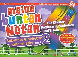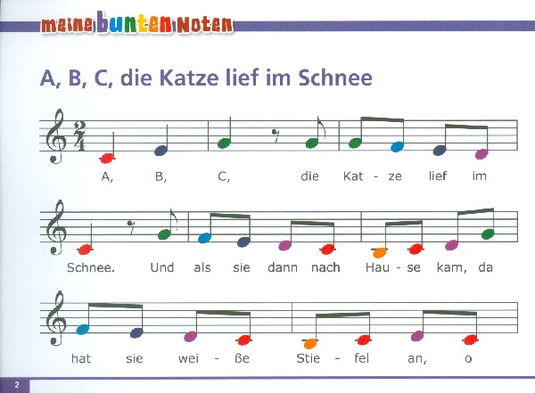 Meine bunten Noten A B C die Katze lief im Schnee Auf der schwäbsche Eisenbahne Auf der Mauer Auf einem Baum ein Kuckuck saß Auf unsrer Wiese gehet was Der Hahn ist tot Die Affen rasen durch den Wald Ein Hund kam in die Küche Ein der Mann der sich Kolumbus nannt Ein Schneider fing 'ne Maus Ein Vogel wollte Hochzeit machen Es war eine Mutter Froh zu sein Hänschen klein Ich geh mit meiner Laterne Ich kenne einen Cowboy In einem kleinen Apfel Jetzt fahr'n wir übern See Kuckuck Kuckuck Mein Hut der hat drei Ecken Viel Glück und viel Segen Was müssen das für Bäume sein Weißt du wieviel Sternlein stehen Wenn der Topf aber nun ein Loch hat Wenn ich ein Vöglein wär Wir sind die Musikanten Ziehet durch