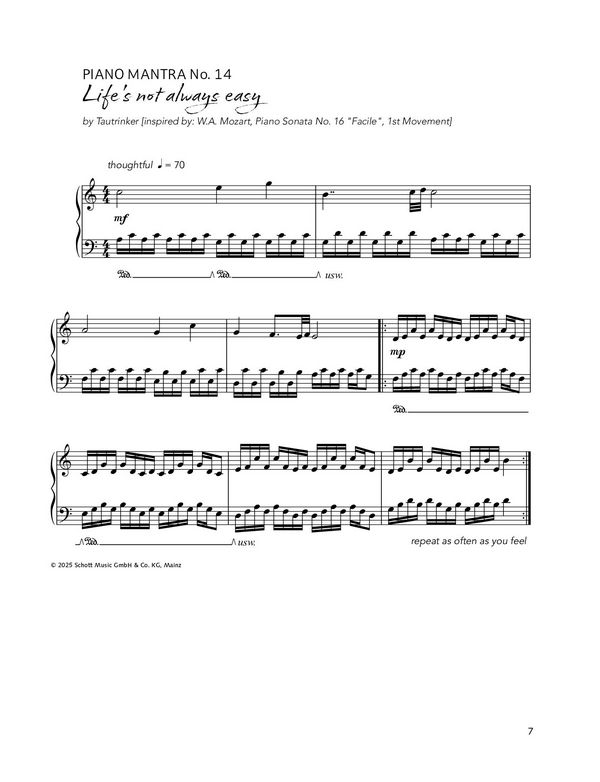 New Arrangements of Mozart's greatest Melodies - like you've never heard them before Spielerisch eine Brücke in die Klassik bauen? Spielerisch eine Lücke schließen, wenn nicht-mehr-ganz-Anfänger Lust auf mehr haben, aber noch nicht bei Bach, Satie oder Yann Tiersen angekommen sind? Wenn es schnell gehen soll und nicht erst 5 Seiten Noten bearbeitet werden wollen? Schott Music und der Komponist, Arrangeur & Songwriter Tautrinker präsentieren ein völlig neues Format: kurze Klavier-Ohrwürmer namens Piano Mantras, die sich an den größten Melodien der Klassik orientieren, selten länger als 8 Takte sind und - mantraartig - wiederholt werden können. Der Weg in die Gehörgänge und Spielfreude sind garantiert. Im nun erschienenen zweiten Band Magic Mozart beschäftigt sich Tautrinker in 12 atmosphärischen Miniaturen mit den bekanntesten Werken des großen Meisters, von Klavierstücken wie Alla Turca über die Zauberflöte bis hin zum Requiem. Mal erkennbar nahe am Original, mal nur erahnbar - auch das musikalische Ohr und die Fähigkeit zur Abstraktion werden hier geschult. Jedem Stück steht visuell eine Illustration gegenüber, die als Inspiration im Sinne des Mantra-Gedankens dient. Jedes Stück steht zudem als Aufnahme via streaming zur Verfügung. Die Schott Piano Mantras sind spielerische Musikvermittlung für angehende und bestehende Pianist:innen einer neuen Generation! Inhalt: 01 Catching Birds? [inspired by: W.A. Mozart, Die Zauberflöte, 'Der Vogelfänger bin ich ja'] 02 Life's not always easy [inspired by: W.A. Mozart, Piano Sonata No. 16 'Facile', 1st Movement] 03 Mozart in Paris [inspired by: W.A. Mozart, Symphony No. 40, 1st Movement] 04 Clarinet Whisper [inspired by: W.A. Mozart, Clarinet Concerto, 2nd Movement] 05 Wedding Bells [inspired by: W.A. Mozart, Le nozze di Figaro, 'Voi che sapete'] 06 Amadeus' Lullaby [inspired by: W.A. Mozart, 'Ave verum corpus'] 07 Light as a Feather [inspired by: W.A. Mozart, Piano Sonata No. 11, 1st Movement] 08 Turkish Dance [inspired by: W.A. Mozart, Piano Sonata No. 11, 3rd Movement 'Alla Turca'] 09 The Pianist [inspired by: W.A. Mozart, Piano Concerto No. 23, 3rd Movement] 10 Divine Love [inspired by: W.A. Mozart, Vesperae solennes de Confessore, 'Laudate Dominum'] 11 Serenade [inspired by: W.A. Mozart, Serenade No. 13 'Eine kleine Nachtmusik', 2nd Movement] 12 Echoes of Lacrimosa [inspired by: W.A. Mozart, Requiem, 'Lacrimosa']