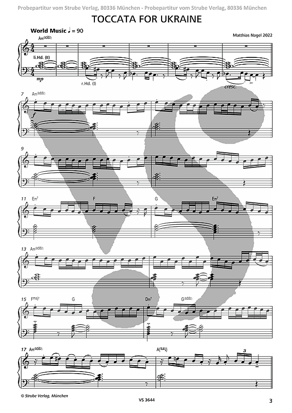 Die gesamten Einnahmen dieser Toccata werden gespendet an: Ärzte ohne Grenzen e. V. Berlin Mitten in die kompositorische Arbeit an einer ganz normalen Toccata in a-moll für Harmonium hinein platzte plötzlich die unfassbare Nachricht aus dem Kriegsgebiet der Ukraine mit all ihren Bildern, Ereignissen, Bedrohlichkeiten, Kommentaren, Sondersendungen, Auswirkungen in und für Europa. Vor diesen unvermeidlichen Eindrücken gewann im Laufe des Kompositionsprozesses die Motivik der Toccata immer mehr slawischen Duktus, die Rhythmik immer mehr popularmusikalischen Weltmusik-Charakter, Dissonanzen immer mehr an Dissonanz, gewannen fröhliche Passagen mehr an Fröhlichkeit, Moll-Passagen immer mehr Eintrübungen, der Schluss verlor immer mehr an Strahlkraft, und büßte ein geplantes, strahlendes A-Dur ein. Und so wollte und sollte es wohl auf einmal die Toccata for Ukraine werden.