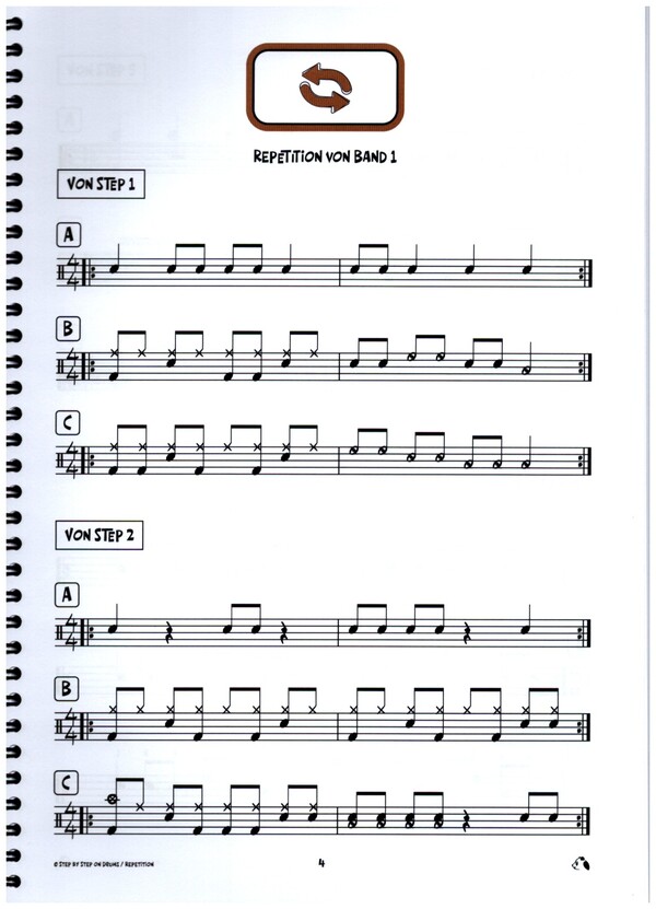 Leitfaden für den Schlagzeugunterricht Dieses Lehrmittel wurde als Leitfaden fur den Musikschulunterricht geschrieben. Es enthält bewusst keine Erklärungen und nur wenig Text, und ermöglicht somit Schlagzeugpädagogen eigenen Ideen umzusetzen. In 20 Schritten, aufgeteilt auf vier Bände, bildet Step by Step on Drums die ideale Grundausbildung in den ersten vier bis sechs Jahren des Schlagzeugunterrichts.