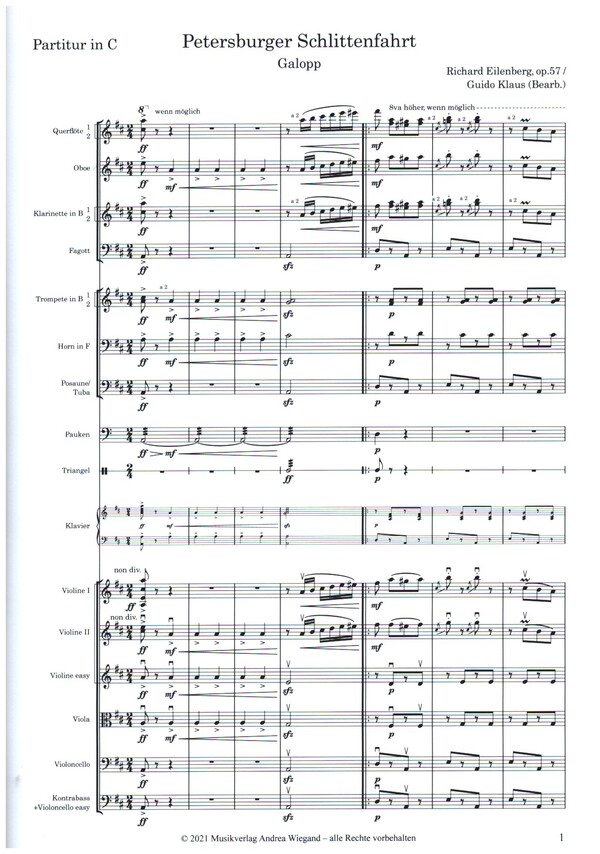 Klaus, Guido, arr. Die Petersburger Schlittenfahrt von Richard Eilenberg (1848-1927) aus dem späten 19. Jahrhundert gehört zu den beliebtesten Orchesterwerken, die unsere winterliche Literatur zu bieten hat. Seit vielen Jahren nutze ich die vierhändige Klavierausgabe für meine Schüler, um den Unterhaltungswert der Weihnachtskonzerte zu steigern. Die vorliegende Ausgabe im Musikverlag Andrea Wiegand geht erstmals neue Wege: Sie bezeichnet die Instrumente in der Partitur und in den Einzelstimmen ganz konkret und folgt dabei dem Aufbau einer normalen Partitur einzige Ausnahme ist die (hier im Verlag übliche) Position der Trompeten über den Hörnern. Um fehlende Instrumente zu ersetzen gibt es weiterhin die üblichen Transpositionen der Originalstimmen in den Sonderstimmen. Ich empfehle als Minimalbesetzung ein vollständiges Streichorchester (die Violine easy macht es möglich, dass wirklich jeder Anfänger mitspielen kann), 2 Querflöten, 2 Klarinetten, 1 Trompete, 1 Posaune und ein Klavier. Das optimale Klangergebnis erzielen Sie, wenn Sie alle Originalinstrumente der Partitur verwenden. Sollten Sie Bläserstimmen verdoppeln (z.B. mehrere Posaunen oder Hörner), dann empfehle ich festzulegen, welche Passagen solistisch gespielt werden und wo die anderen dazukommen. Wenn Sie Instrumente ersetzen, dann denken Sie bitte an die passende Klangfarbe eine Posaune ersetzt das Horn besser als ein Saxophon. Die Partitur ist in C, die Einzelstimmen sind jeweils in der entsprechenden Stimmung notiert.