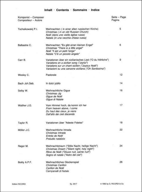 Kaluza, Günter, ed Weihnachten in einer alten russischen Kirche= Tschaikowsky Es gibt einen kleinen Engel (Balbastre) Variationen über ein sizilianisches Lied = O du fröhliche Pastorale /Wesley) In dulci jubilo (Bach) Weihnachtliche Gigue Vom himmel hoch da komm ich Herr (Walther) Variationen über Adeste fideles (Taylor) Weihnachtstraum (Reger) Carillon de noel (Boely) Süße Träumerei (Tschaikowsky) Die Hirten an der Krippe (Liszt) Weihnachten in Angers (Franck) Knecht Ruprecht (Schumann) Märchen (Martinu) Ah vous dirai-je maman (Mozart)