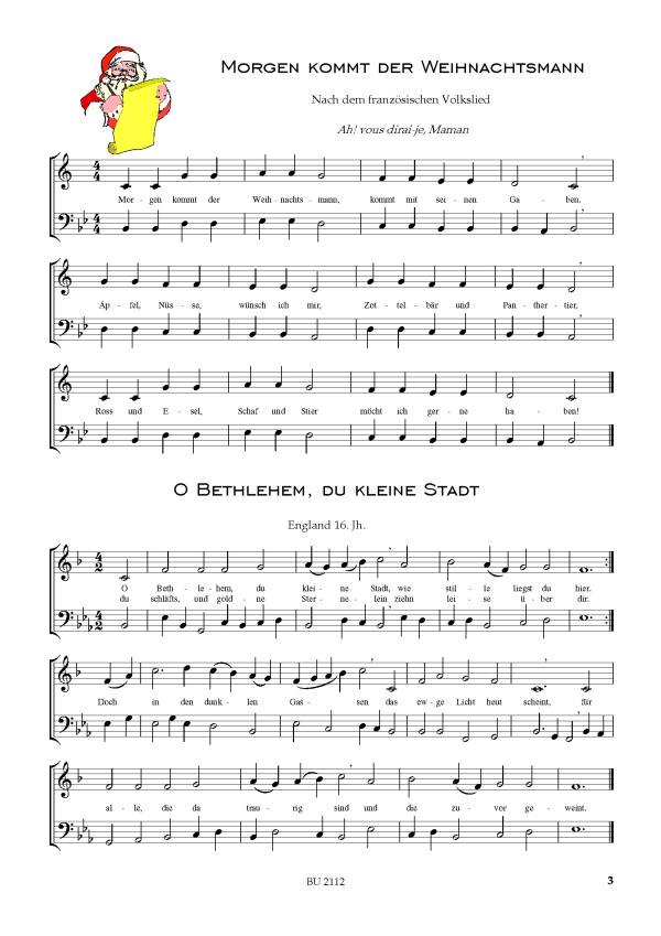 Mühlbacher, Rainer, arr. Alle Jahre wieder Am Weihnachtsbaum die Lichter brennen Dein König Zion kommt zu dir Die Tage sind so dunkel Es ist ein Ros entsprungen Es kommt ein Schiff Es wird schon gleich dunkel Freu dich Erd und Sternenzelt Gegrüßest seist du Maria Guten Abend gut' Nacht Herbei o ihr Gläubigen Hört der Engel helle Lieder Hosianna Davids Sohn Ihr Kinderlein kommet Inmitten der Nacht In dulci jubilo Joseph lieber Joseph mein Kling Glöckchen klingelingeling Kommet ihr Hirten Lasst uns alle fröhlich sein Lasst uns das Kindlein wiegen Lobt Gott ihr Christen alle gleich Mach hoch die Tür Maria duch ein' Dornwald ging Martin ist ein frommer Mann Mit den Hirten will ich gehen Morgen kommt der Weihnachtsmann Morgenstern auf finstre Nacht Nikolauslied Nun sei willkommen O Bethlehem du kleine Stadt O du fröhliche O du mein Trost und süßes Hoffen O freudenreicher Tag O heilige Nacht O Jesulein zart dein Kripplein O Jubel o Freud O Tannenbaum du trägst ein' grünen Zweig Schneeflöckchen Weißröckchen Sieh dein König kommt zu dir Spielt auf Trabanten Stille Nacht heilige Nacht Tochter Zion Vom Himmel hoch o Englein kommt Wenn alle Sternlein schlafen geh'n Wenn Weihnachten ist Wie soll ich dich empfangen Zu Bethlehem geboren